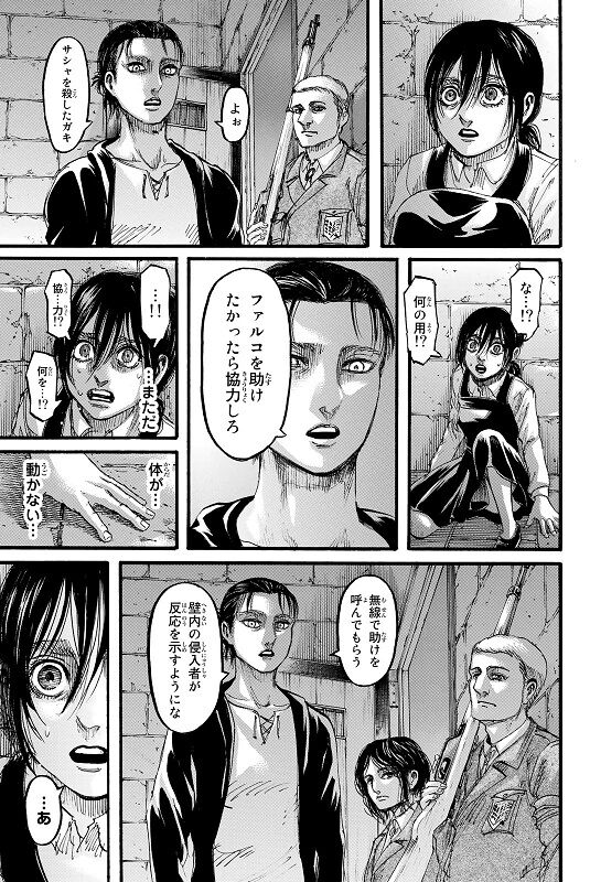 この時アルミンのこと押さえつけたミカサ見てビビったんだろうな…